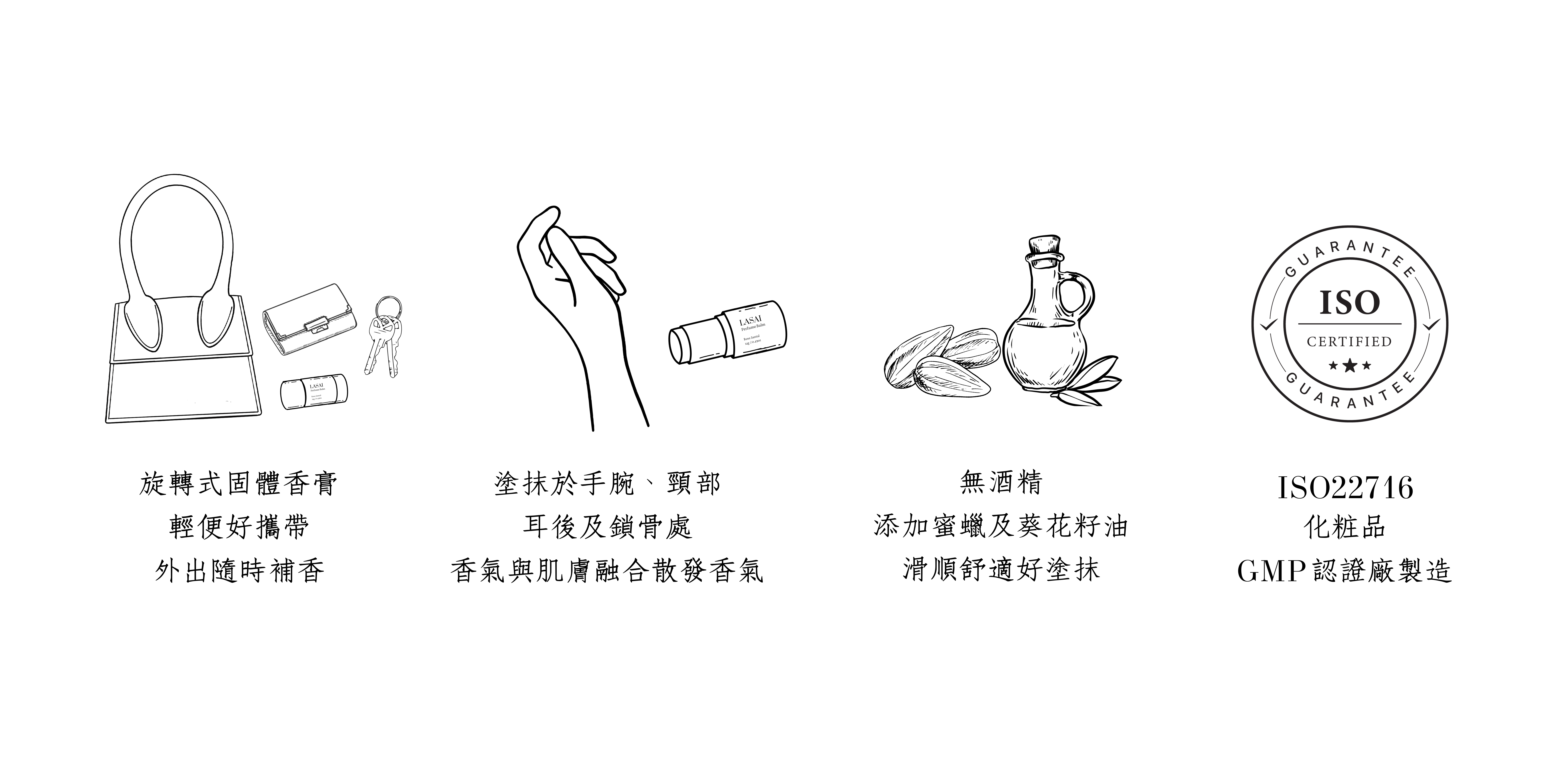 輕輕轉出後塗抹於手腕、手肘內側、頸部、耳後及鎖骨處,平均持香約5~6小時