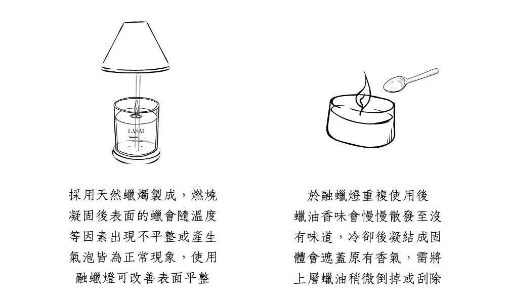 c.採用天然蠟燭製成,燃燒凝固後表面的蠟會隨溫度等因素出現不平整或產生氣泡皆為正常現象,使用融蠟燈可改善表面平整。
